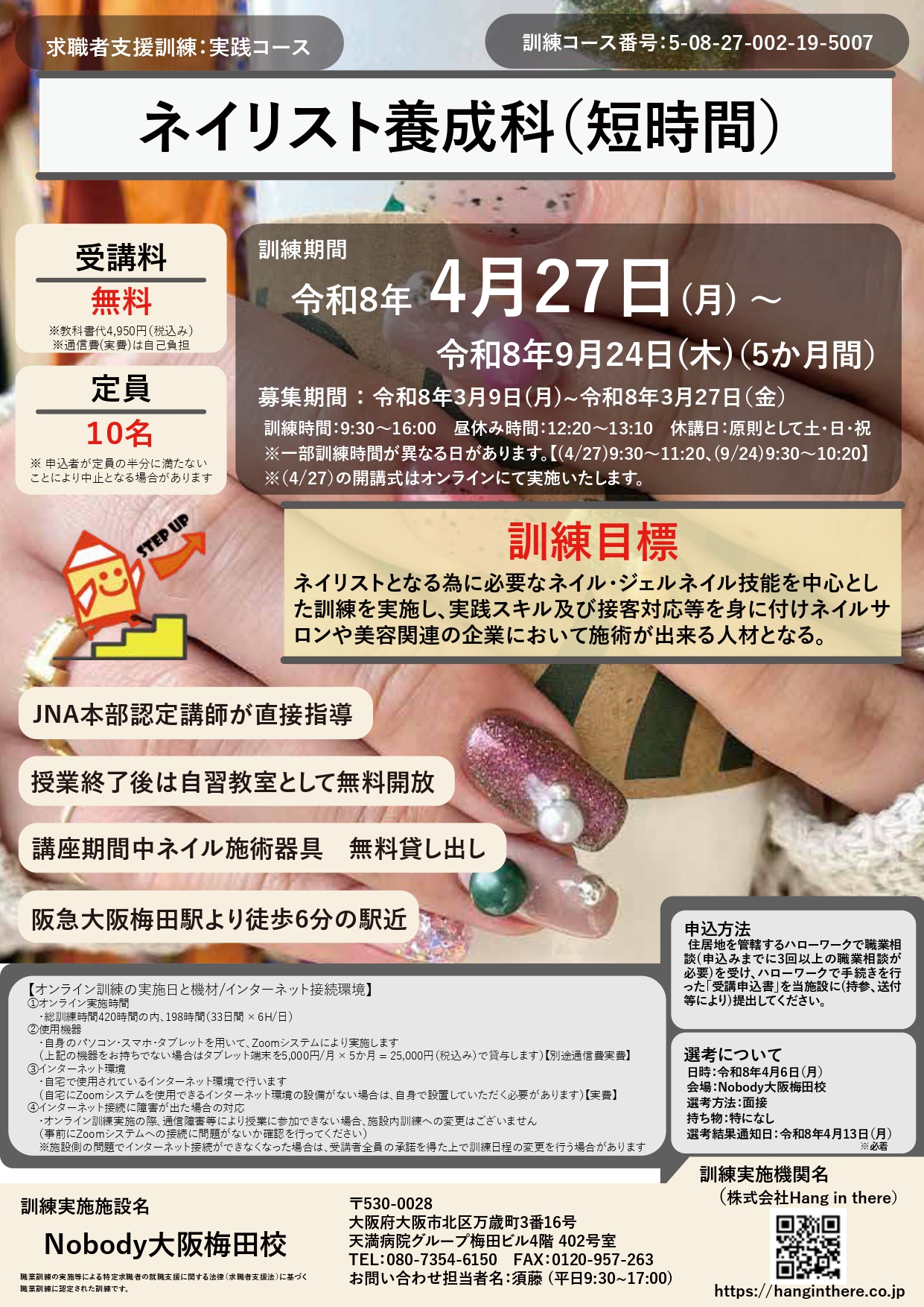 プロのネイリストとなる為に必要であるネイル・ジェルネイル技能を中心に訓練を行い、更に実践スキル及び接客・接遇とコミュニケーション能力等を身に付け、ネイルサロン・美容関連等の企業において活用・施術が出来る人材の育成を目標としています。